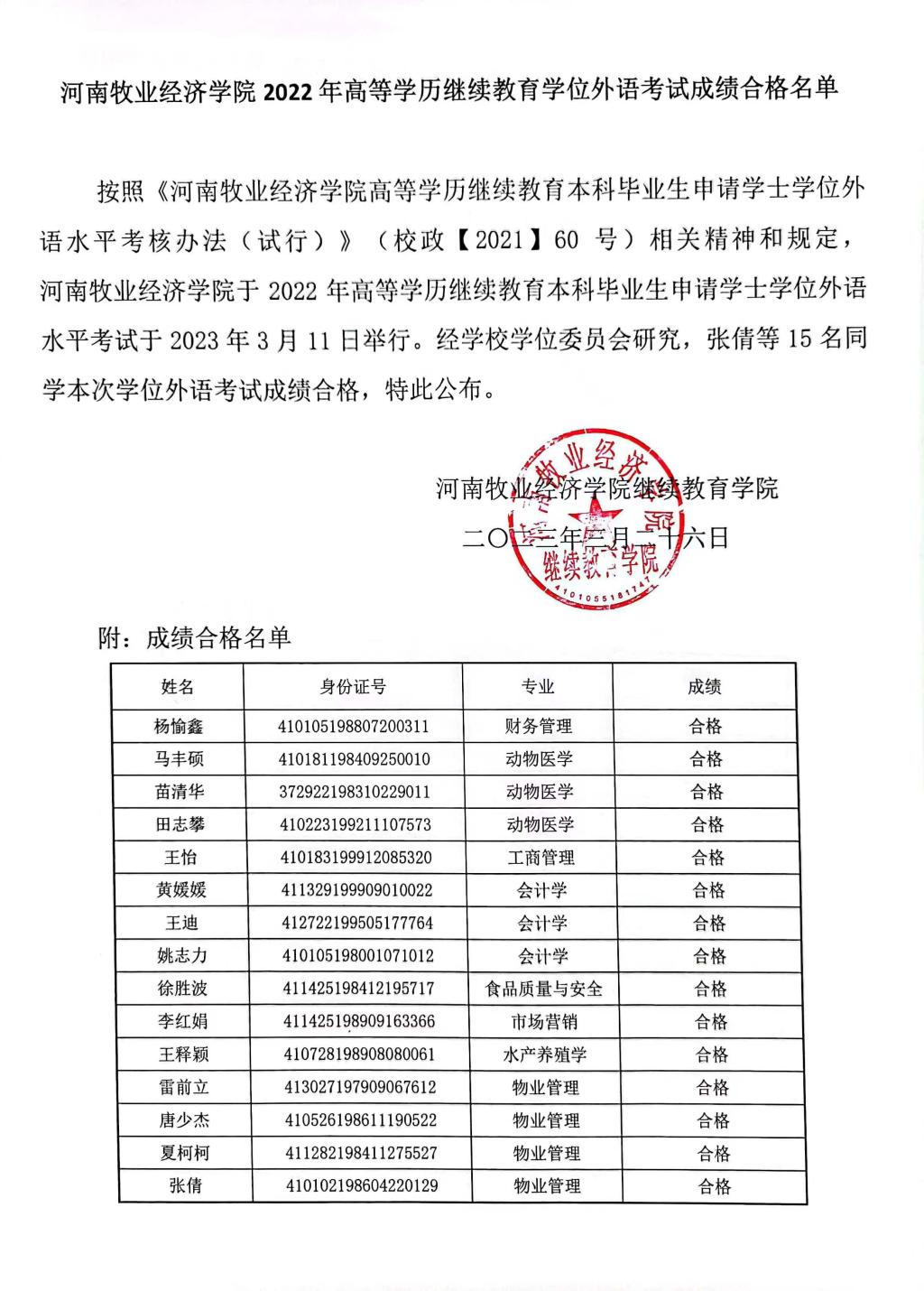 太阳成tyc33455cc2022年高等学历继续教育学位外语考试成绩合格名单公示