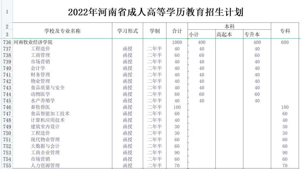 根据教发规〔2022〕362 号 《河南省教育厅 关于下达 2022 年河南省成人高等学历教育招生计划的通知》和《教育部办公厅关于做好 2022 年全国成人高校招生工作的通知》(教学厅〔2022〕4 号)精神,按照工作安排,教育厅组织编制了 2022 年成人高等学历教育分学校分专业招生计划,下达我校各专业指标如下: